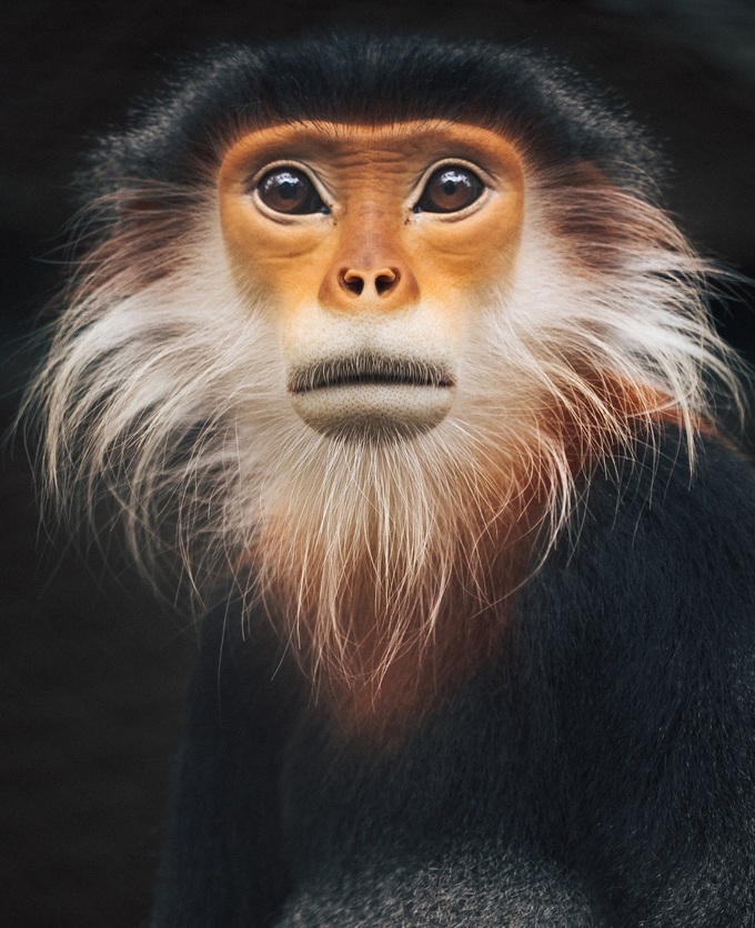 Các khu rừng Việt Nam che chở hàng chục loài linh trưởng - vượn, khỉ và voọc. Nhiều loài có bộ lông sặc sỡ, tương phản, mang đặc trưng của linh trưởng vùng nhiệt đới. Trong ảnh là một con voọc chân nâu ở Cúc Phương với bộ lông đen và khuôn mặt sinh động như thổ dân sau khi khóa trang.