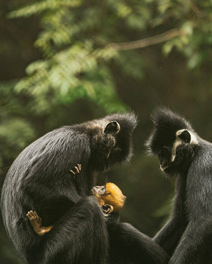 Một gia đình voọc vui đùa tại Trung tâm cứu hộ linh trưởng ở vườn quốc gia Cúc Phương. Loài voọc đang được các chuyên gia chăm sóc, bảo vệ vì chúng có nguy cơ tuyệt chủng do săn bắt trái phép.