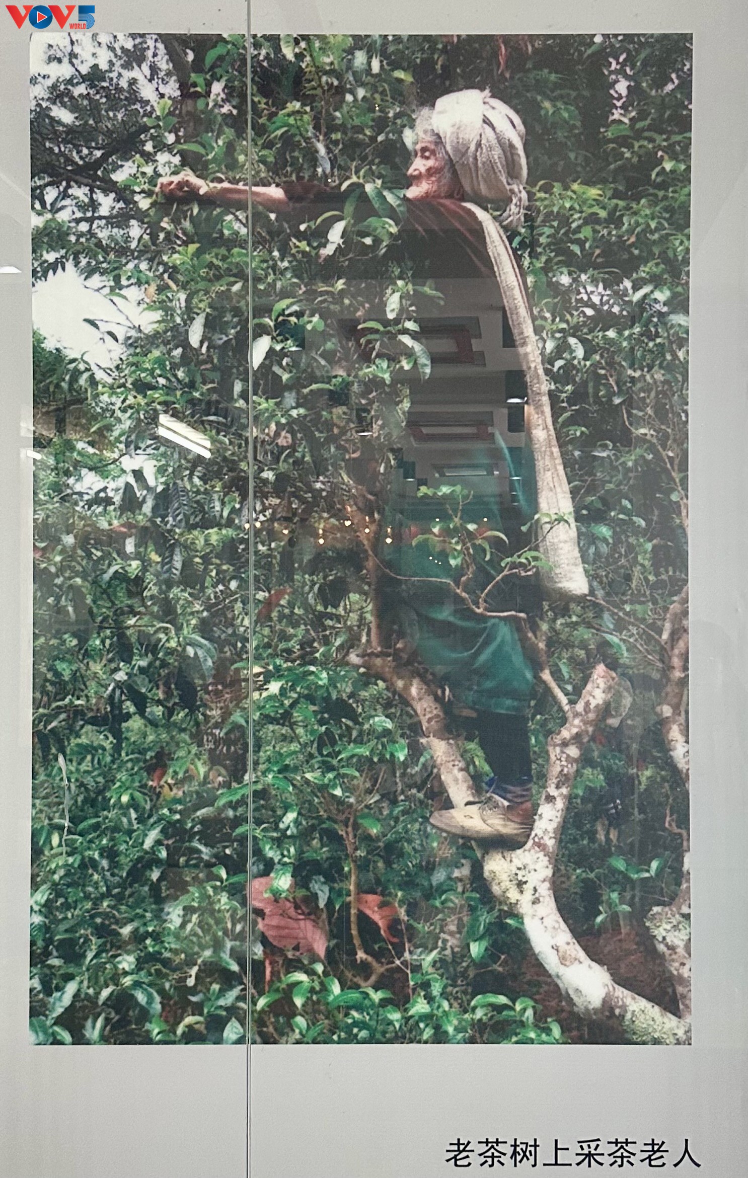 Một bà lão đang hái trà trên cây cổ thụ. |
