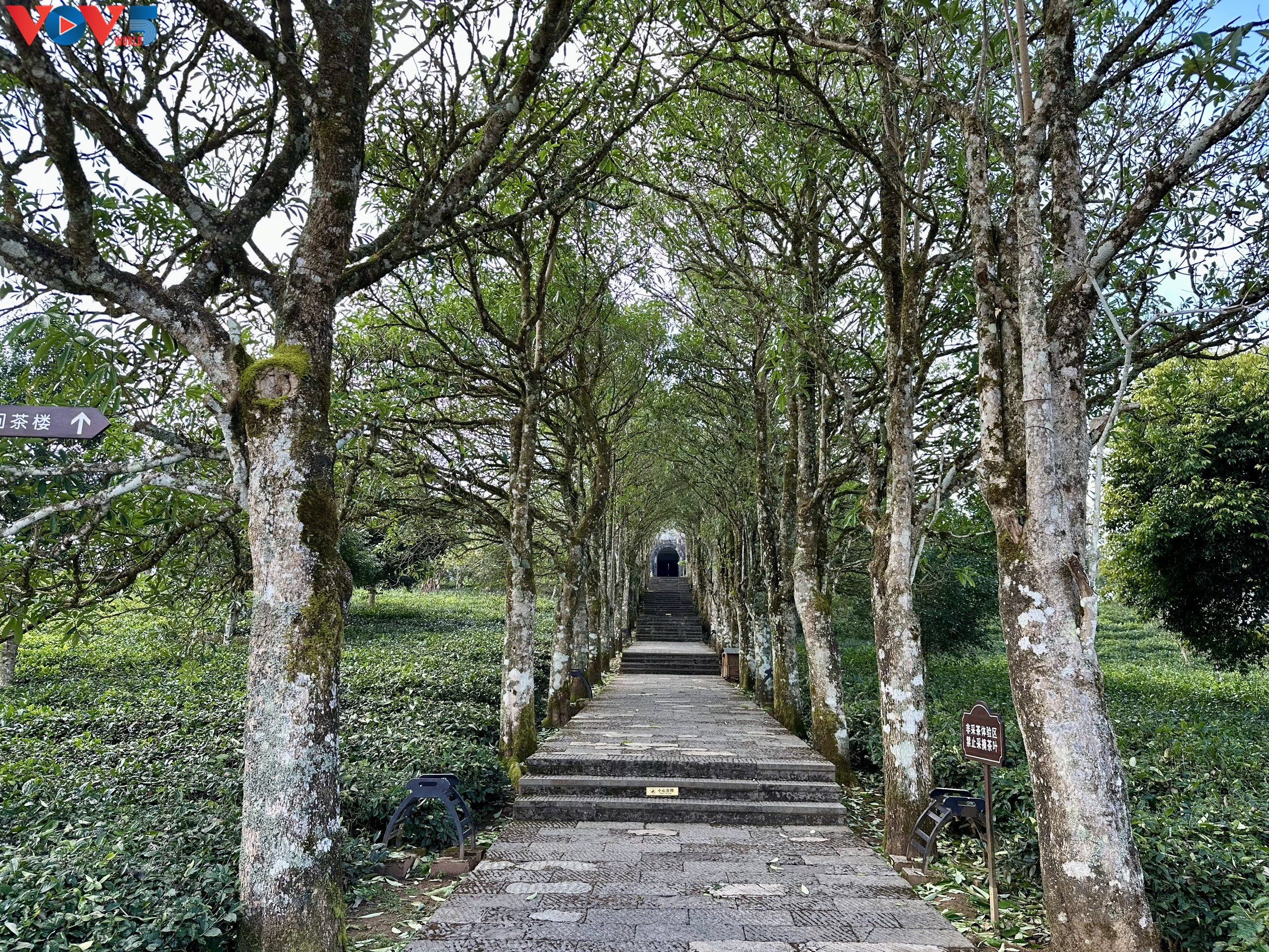 Đường lên Vấn Trà lâu - nơi đàm đạo và thưởng thức trà đạo nằm ở phần trung tâm của toàn bộ danh lam thắng cảnh, ở vị trí một ngọn đồi cao nhất. Từ trên lầu, du khách có thể tận hưởng phong cảnh của 1.534 ha vườn trà sinh thái.
