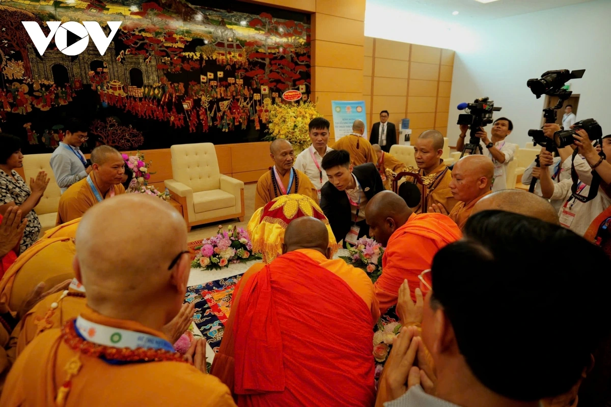 | Đây là chuyến bay ưu tiên đặc biệt theo kế hoạch phối hợp giữa Giáo hội Phật giáo Việt Nam và các cơ quan chức năng, nhằm phục vụ nghi lễ cung rước xá lợi Phật - một sự kiện mang ý nghĩa tâm linh sâu sắc, đồng thời là hoạt động giao lưu văn hóa, tín ngưỡng quốc tế quan trọng. Ảnh: Cung kính rước xá lợi Phật tại sân bay Nội Bài |