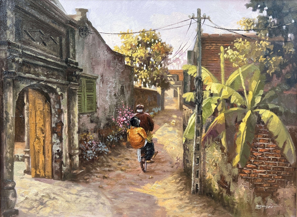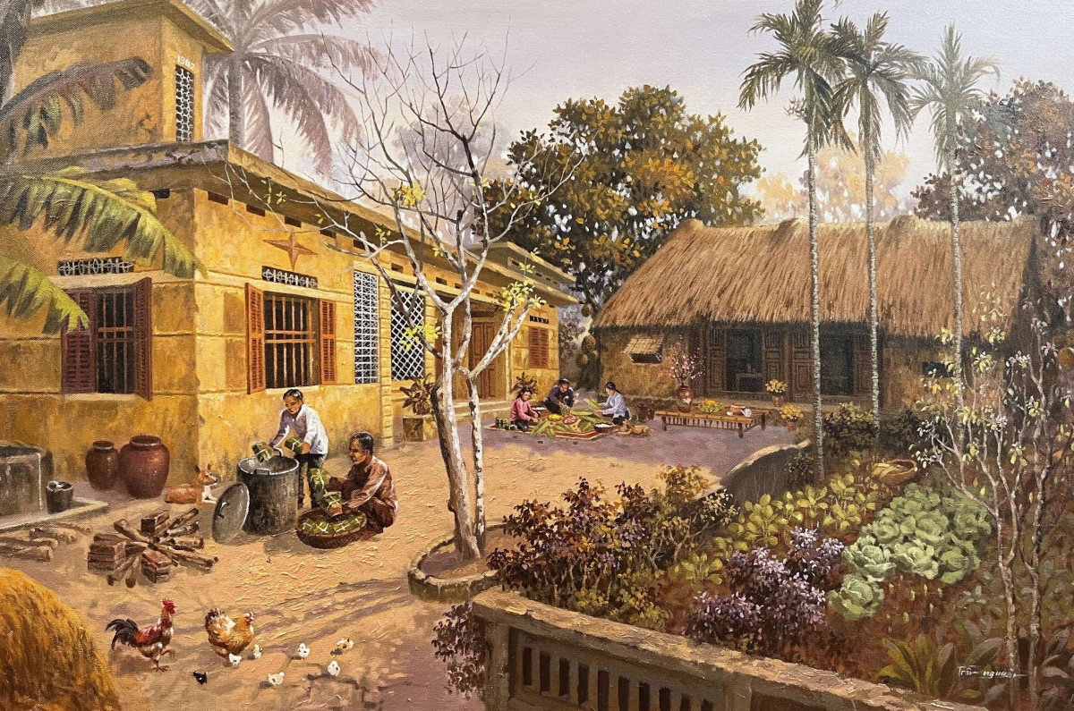 Mỗi bức tranh của Trần Nguyên như thước phim ngược dòng thời gian, đưa khán giả trở về quá khứ với khung cảnh Tết đậm chất làng quê Bắc Bộ xưa. |