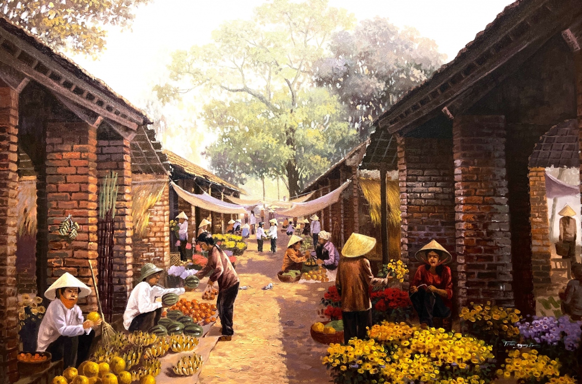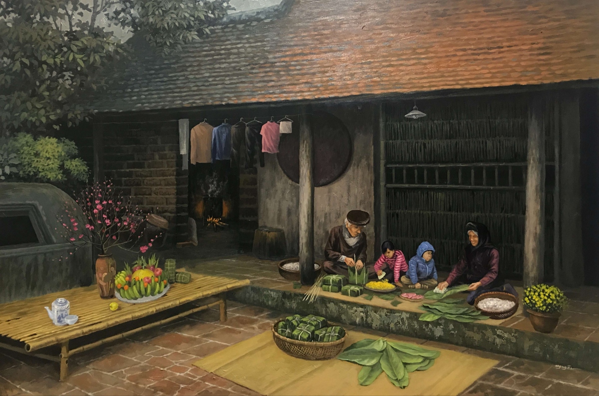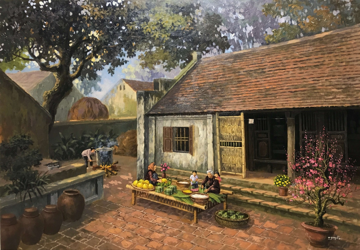 Hồn Tết xưa được tái hiện rõ nét trong tranh của hoạ sĩ Trần Nguyên. |