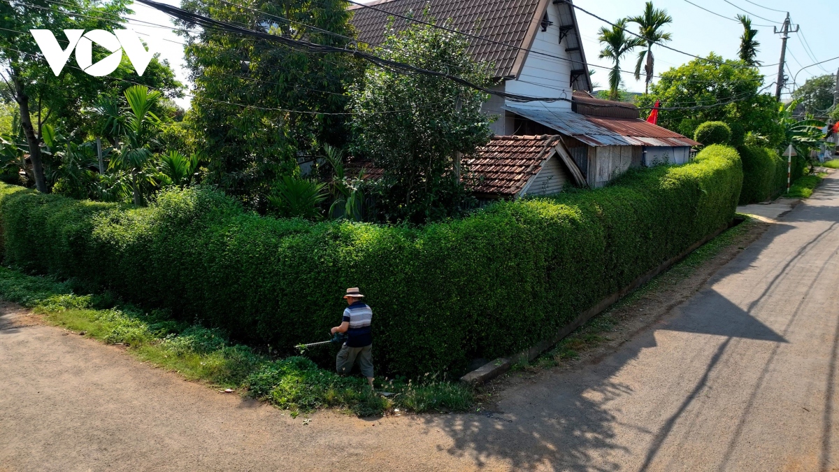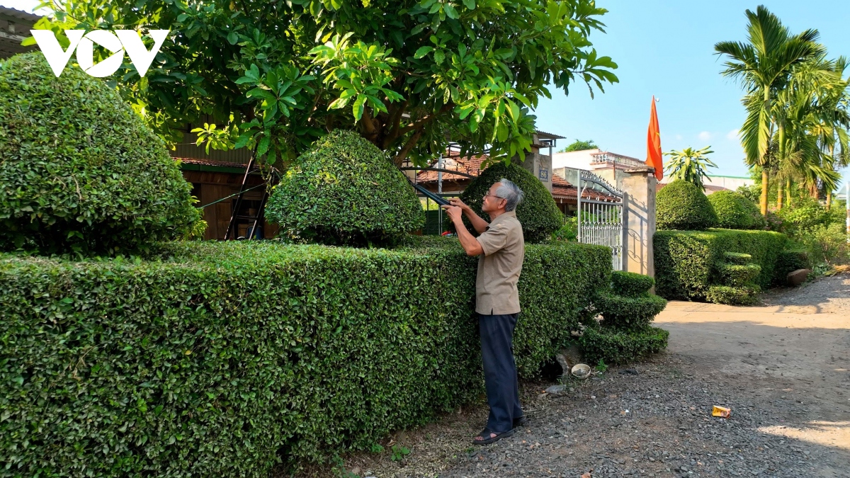 Ông Nguyễn Thắng, ở tổ dân phố 6, cho biết: hào rào chè Tàu của gia đình được trồng ngay từ những năm đầu tới dây xây dựng kinh tế mới; đã được chăm chút, cắt tỉa qua 2 thế hệ.(ảnh Chân Lê)