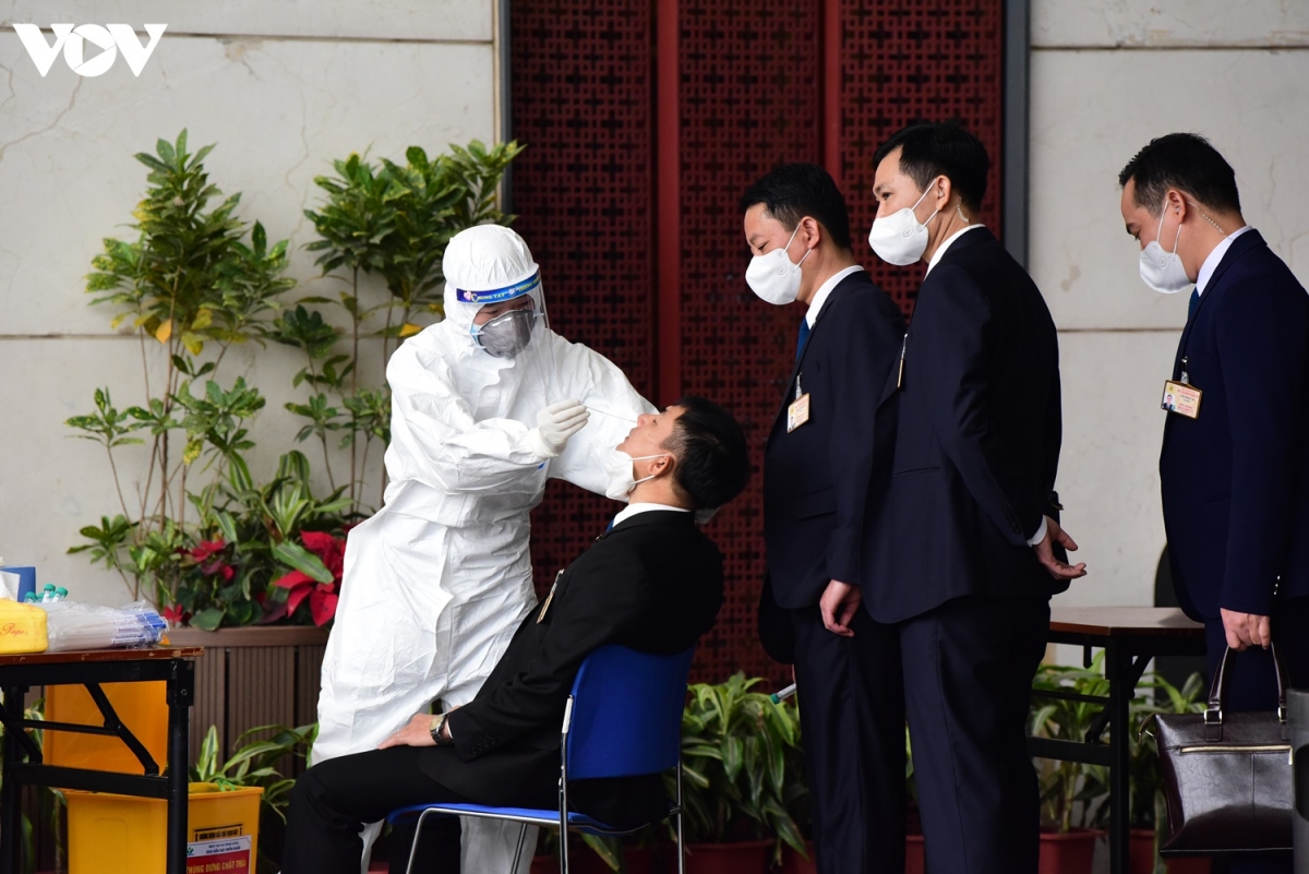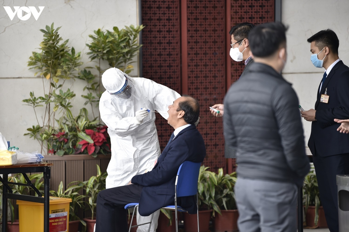 Các thành viên cấp cao trong Ban tổ chức Đại hội Đảng lần thứ XIII cũng tham gia xét nghiệm. Trong ảnh: Thứ trưởng Bộ Ngoại giao Nguyễn Quốc Dũng tham gia xét nghiệm Covid-19.