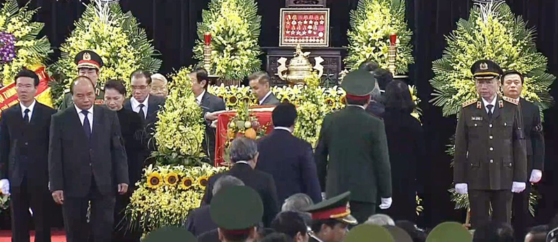 Thủ tướng Nguyễn Xuân Phúc và Chủ tịch Quốc hội Nguyễn Thị Kim Ngân cùng nâng linh cữu di chuyển tới cỗ linh xa.