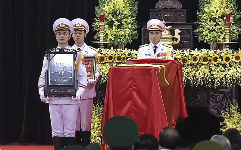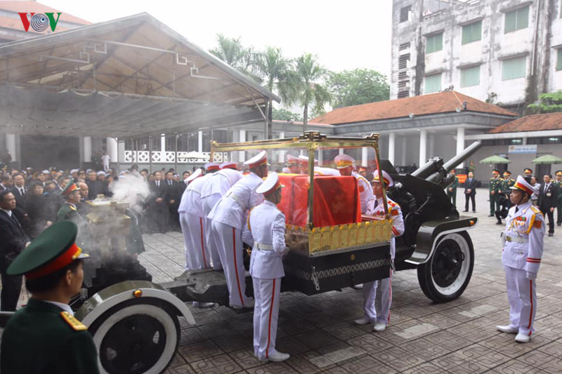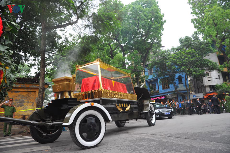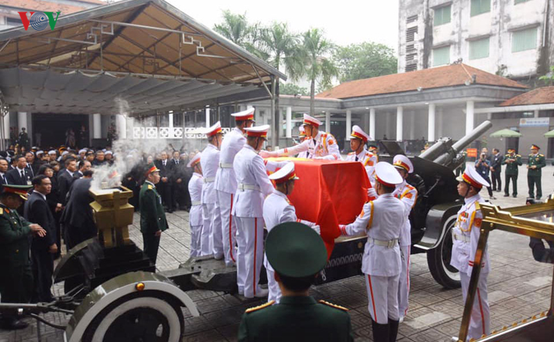 Linh cữu Đại tướng Lê Đức Anh được đội nghi lễ cẩn trọng đặt lên cỗ linh xa, lá Quốc kỳ được phủ lên linh cữu.