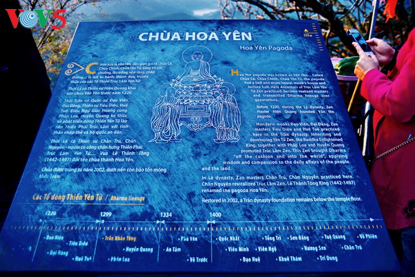Mái chùa Hoa Yên nổi bật trên nên trời. Chùa Hoa Yên có tên cũ là chùa Vân Yên, dân gian thường gọi là chùa Cả, chùa Chính hay chùa Yên Tử. Chùa Hoa Yên là ngôi chùa lớn, to và đẹp nhất trong khu di tích danh thắng Yên Tử. Đây là nơi chứng kiến đức vua Trần Nhân Tông sau khi dứt bỏ hồng trần đã hướng tâm về nơi Phật pháp và lập ra Thiền phái riêng mà ngày nay mọi người vẫn gọi là Thiền phái Trúc Lâm.