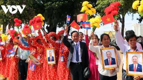 (VOV5) - Dọc các tuyến đường từ sân bay quốc tế Phnom Penh về trung tâm Thủ đô, người dân cầm hoa, cờ hai nước Việt Nam và Campuchia chào đón Chủ tịch nước Tô Lâm.
