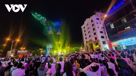 (VOV5) - Tối 5/5, bầu trời phía trên tượng đài chiến thắng ở thành phố Điện Biên Phủ, tỉnh Điện Biên xuất hiện nhiều hình ảnh khổng lồ được tạo từ hàng trăm drone phát sáng