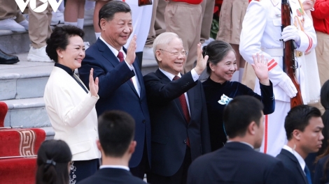 (VOV5) - Chiều 12/12, trong tiếng đại bác rền vang, Quốc thiều Việt Nam và Trung Quốc cất lên bắt đầu lễ đón cấp nhà nước với Tổng Bí thư, Chủ tịch Trung Quốc Tập Cận Bình và Phu nhân. Đây là nghi thức đón nguyên thủ quốc gia trang trọng nhất của Việt Nam.