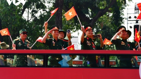 (VOV5) - Khối Tôn vinh các Anh hùng lực lượng vũ trang nhân dân, Anh hùng lao động và nhân chứng lịch sử gồm 350 đại biểu lần đầu xuất hiện và diễu qua khán đài trên xe buýt 2 tầng trong lễ kỷ niệm 50 năm Ngày Giải phóng miền Nam, thống nhất đất nước (30/4/1975-30/4/2025).