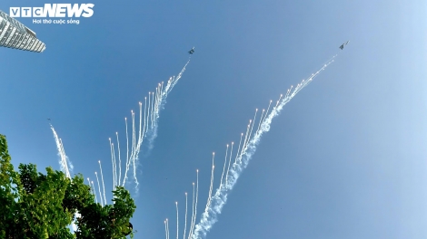 Cận cảnh trực thăng kéo cờ, tiêm kích Su30-MK2 thả nhiễu trên bầu trời TP. Hồ Chí Minh