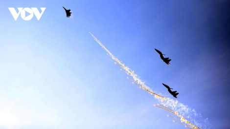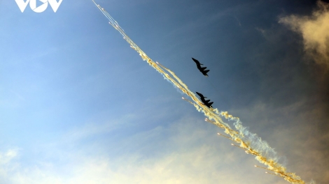 (VOV5) - Lần đầu tiên phi đội tiêm kích bay chào mừng diễu binh, diễu hành tại lễ kỷ niệm 50 năm Giải phóng miền Nam, thống nhất đất nước thả bẫy nhiệt trên bầu trời TP. Hồ Chí Minh trong lễ tổng duyệt cấp Nhà nước.