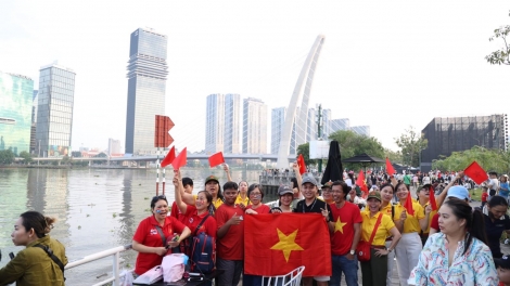 (VOV5) - Trong khi khu vực đường Lê Duẩn đang diễn ra buổi tổng duyệt diễu binh, diễu hành thì khu vực Bến Bạch Đằng (Quận 1) và Công viên thành phố Thủ Đức (thành phố Thủ Đức) cũng rất đông người dân đang "ngóng" màn trình diễn đại bác và máy bay.