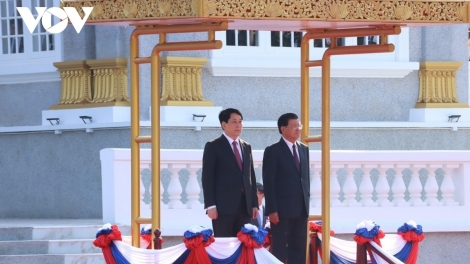 (VOV5) - Ngày 24/4, lễ đón chính thức Chủ tịch nước Lương Cường cùng Đoàn đại biểu cấp cao Việt Nam thăm cấp Nhà nước đến CHDCND Lào đã diễn ra trọng thể tại Phủ Chủ tịch nước Lào ở Thủ đô Vietiane.
