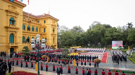(VOV5) - Chiều nay 14/4 tại Phủ Chủ tịch, Tổng Bí thư Tô Lâm chủ trì lễ đón trọng thể Tổng Bí thư, Chủ tịch nước Trung Quốc Tập Cận Bình theo nghi thức cao nhất dành cho nguyên thủ quốc gia.