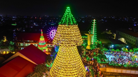 (VOV5) - Cây thông Noel được làm từ 3.800 chiếc nón lá với chiều cao gần 40m, mỗi đêm nơi đây thu hút hàng nghìn du khách trong và ngoài tỉnh Đồng Nai đến "săn ảnh".
