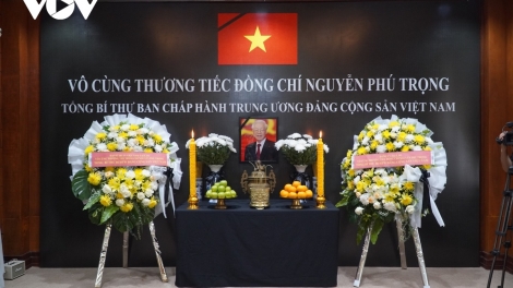 (VOV5) - Sáng 25/7, tại Đại sứ quán Việt Nam tại Lào trang trọng tổ chức Lễ viếng Tổng Bí thư Nguyễn Phú Trọng.