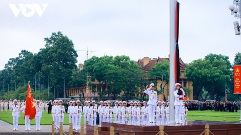 (VOV5) - Sáng 25/7, tại Quảng trường Ba Đình diễn ra nghi thức kéo cờ rủ, đánh dấu thời khắc bắt đầu hai ngày Quốc tang Tổng Bí thư Nguyễn Phú Trọng.