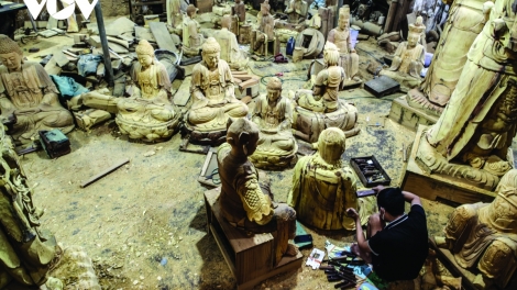 (VOV5) - Làng Sơn Đồng (xã Sơn Đồng, huyện Hoài Đức, Hà Nội) nổi tiếng với nghề tạc tượng Phật, tượng Mẫu, điêu khắc gỗ truyền thống và sản xuất đồ thờ cúng mỹ nghệ