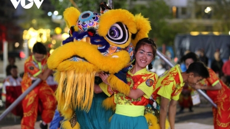 Hàng trăm người dân nô nức xem múa lân Đại hội Thể thao toàn quốc lần thứ IX