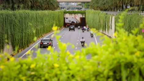 (VOV5) - Những ngày hè oi bức, đi qua khu vực hầm chui Vành đai 3 ai nấy đều cảm thấy bất ngờ khi vách đường hầm được bao phủ bởi những dàn cây dây leo xanh mướt.
