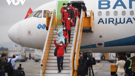 (VOV5) - ĐT nữ Việt Nam đặt chân xuống sân bay Nội Bài (Hà Nội) trong niềm vui chiến thắng sau khi giành vé tham dự VCK World Cup nữ 2023.