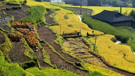 (VOV5) -Ruộng bậc thang ở bản Phùng còn giữ được nguyên vẻ đẹp hoang sơ. Mùa lúa chín, ánh vàng rực rỡ trải dài trên các sườn đồi.