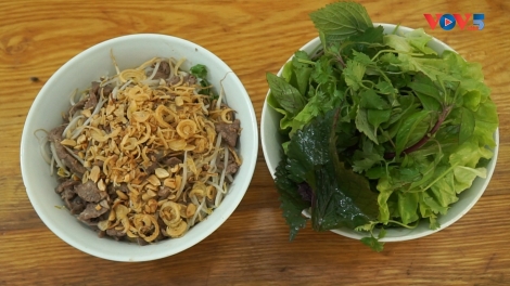 (VOV5) -Bát bún bò Nam Bộ là tổng hòa của nhiều thành phần đa dạng như thịt bò xào, lạc rang, giá đỗ, rau sống, hành phi…