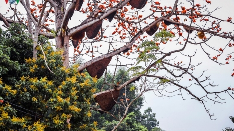 Đẹp ngỡ ngàng cây gạo hoa rực đỏ với hàng chục đàn ong tìm về làm tổ