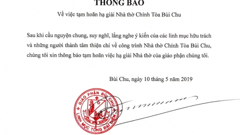 (VOV5) -Ngày 10/5, linh mục Giuse M. Nguyễn Đức Giang, Tổng đại diện - Trưởng Ban xây dựng nhà thờ Chính tòa Bùi Chu, cho biết sẽ tạm hoãn hạ giải Nhà thờ chính tòa Bùi Chu, tỉnh Nam Định.