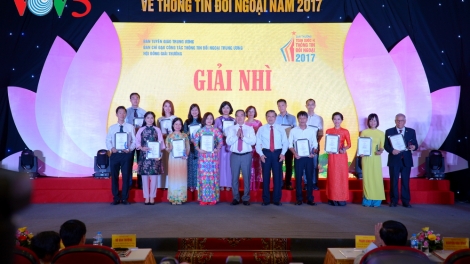 (VOV5) - Ngày 14/6, tại Hà Nội, Ban Tuyên giáo Trung ương, Ban Chỉ đạo Công tác thông tin đối ngoại Trung ương phối hợp với Báo Nhân dân tổ chức Lễ trao giải Giải thưởng toàn quốc về thông tin đối ngoại năm 2017 (Tác phẩm báo chí và sách), nhằm ghi nhận và tôn vinh những tác giả, tác phẩm báo chí và sách xuất sắc trong lĩnh vực thông tin đối ngoại.