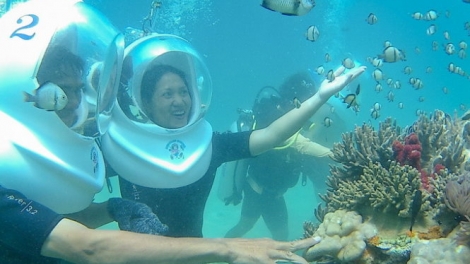 (VOV5)- Chụp chiếc mũ lặn như phi hành gia, qua lớp kính trong vắt, du khách có thể nhìn rõ những mảng san hô rực rỡ, hay từng đàn cá sặc sỡ bơi dưới đáy biển, thậm chí đưa tay chạm vào đàn cá vẫn không làm chúng hoảng sợ.