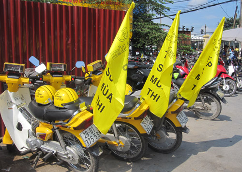 Ngoài cổng bến Giáp Bát, 5 chiếc xe "taxi 2 bánh" của công ty TNHH Đầu tư & CD Việt Pháp luôn sẵn sàng làm xe ôm miễn phí cho phụ huynh và sĩ tử