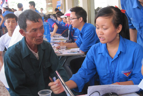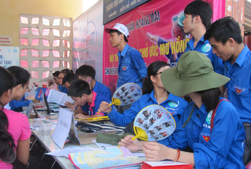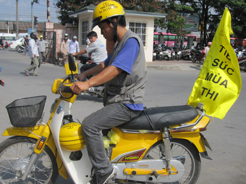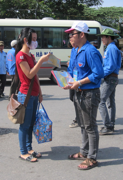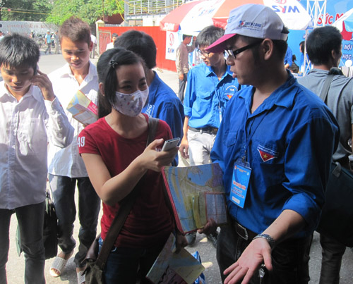 Giữa cái nắng như đổ lửa, sinh viên tình nguyện với khuôn mặt đẫm mồ hôi nhưng luôn tươi rói nụ cười, hết lòng vì sĩ tử, chỉ đường, hỗ trợ tìm nhà trọ, phát miễn phí bản đồ, thuốc chống say xe, làm xe ôm miễn phí...