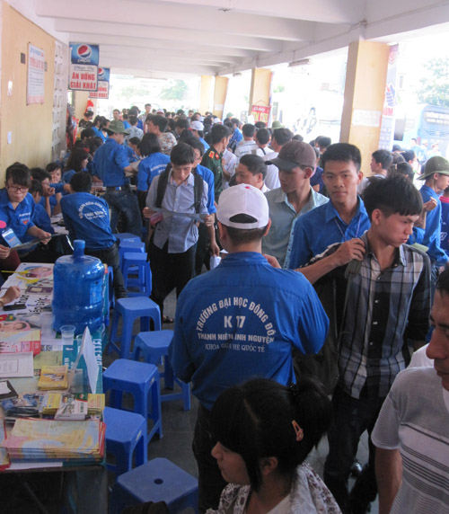 Sáng nay, tại bến xe Giáp Bát, có đến vài trăm sinh viên tình nguyện sẵn sàng hỗ trợ thí sinh