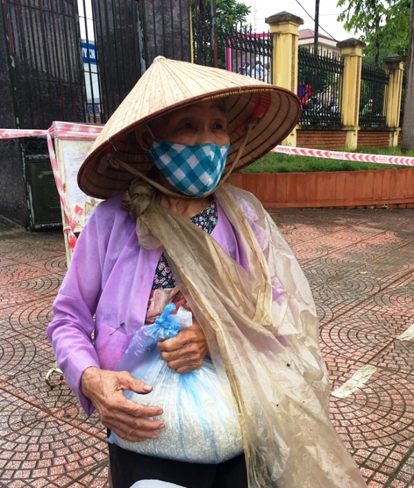 Trời mưa mỗi lúc thêm nặng hạt, thế nhưng dòng người xếp hàng ngày một đông hơn. Bà con đội mưa chờ đến lượt, mỗi người đứng cách nhau 2 mét theo đúng quy định. Bà Mý, người dân tộc Mường ôm bọc gạo trước ngực,bước từng bước chân tập tễnh đi ra phía cổng nhà văn hóa.“Tôi đi từ 6h sáng để đến đây kịp giờ nhận gạo. Cảm ơn đã cho chúng tôi gạo. Từng này gạo là tôi ăn thêm được mấy bữa rồi!” – bà Mý nói.
