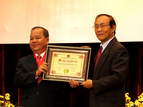 | Ông Trần Hữu Tâm, Phó Chủ tịch Hội Bảo trợ bệnh nhân nghèo TP HCM (trái), thay mặt hội đón nhận Kỷ lục Guinness Việt Nam về số ca phẫu thuật mắt miễn phí |