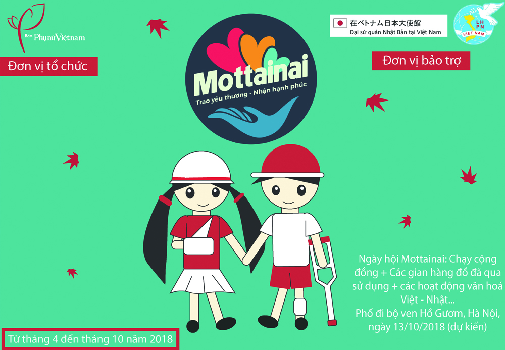 Chương trình Mottainai “Trao yêu thương - Nhận hạnh phúc” 2018 vì trẻ em mồ côi, trẻ em bị ảnh hưởng bởi tai nạn giao thông do báo Phụ nữ Việt Nam tổ chức, là hoạt động thiết thực kỷ niệm 45 năm quan hệ ngoại giao Việt Nam - Nhật Bản và 88 năm Ngày thành lập Hội Liên hiệp Phụ nữ Việt Nam 20/10,