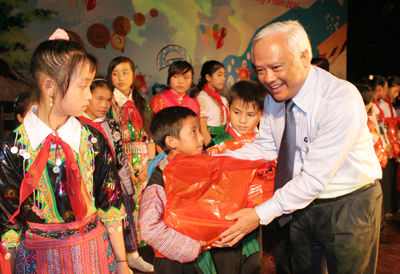| Phó Chủ tịch Quốc hội Uông Chu Lưu tặng quà cho thiếu nhi dân tộc thiểu số tỉnh Hòa Bình (Ảnh: Báo Hòa Bình) |