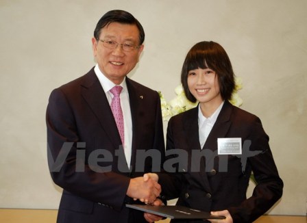 | Chủ tịch Kumho Asiana Park Sam-koo trao học bổng cho các sinh viên Việt Nam. (Ảnh: Vũ Toàn-Phạm Duy/Vietnam+) |