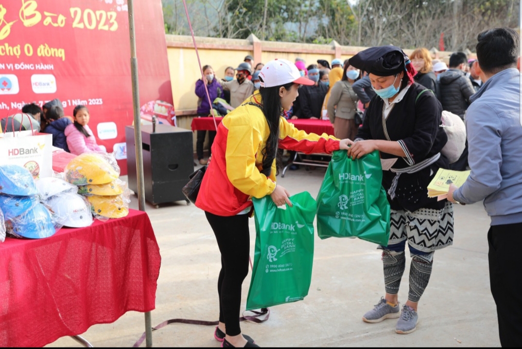 Nhà tài trợ tặng quà cho bà con tại Hội chợ 0 đồng. Ảnh do Ban tổ chức cung cấp