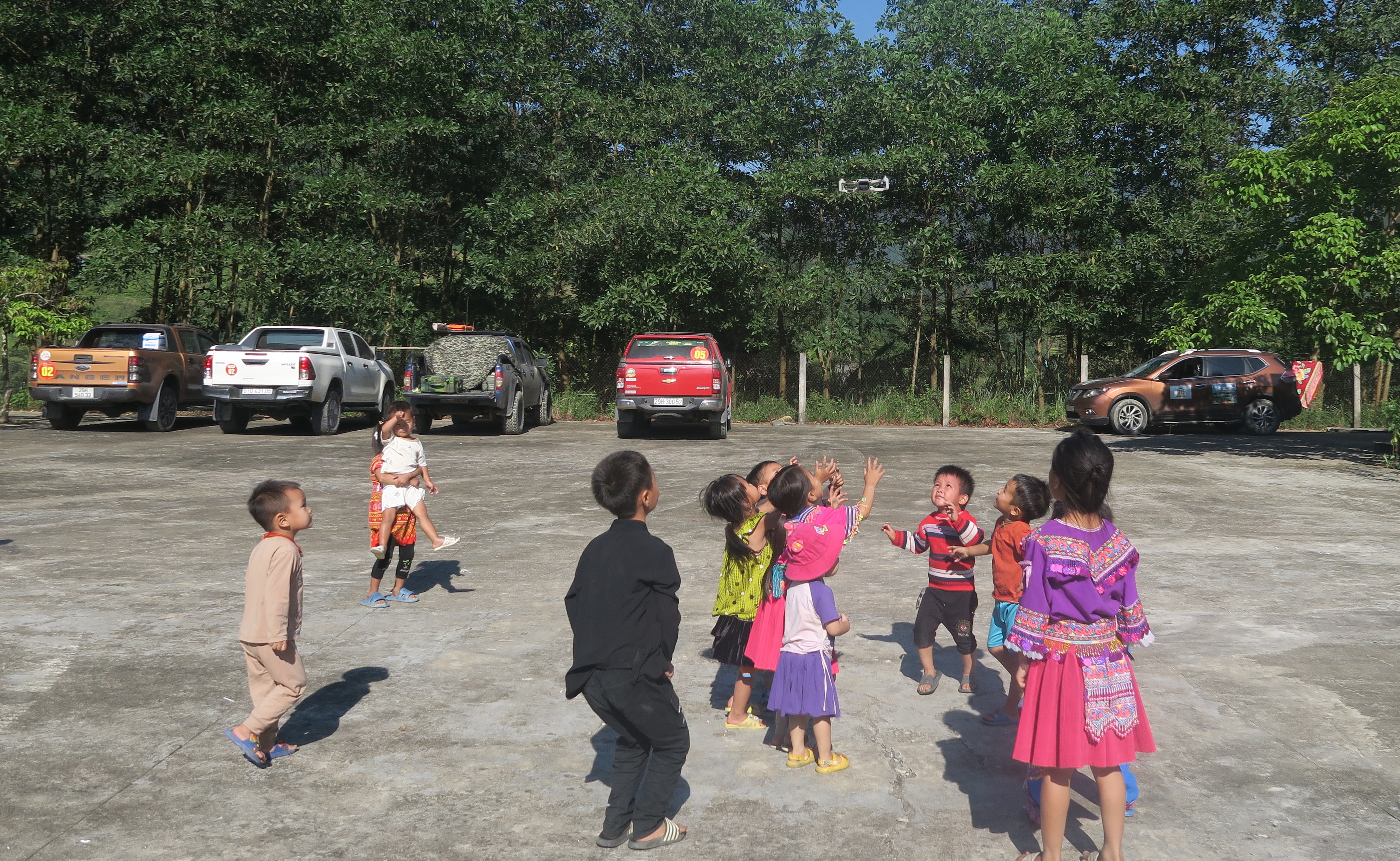 Nhìn thấy một chiếc flycam đang bay lượn. Các em nhỏ chạy ùa ra sân trường vẫy tay reo hò. Nguồn ảnh: Nhóm "Trái tim vì cộng đồng". |