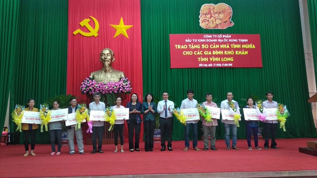 Phó Chủ tịch nước Đặng Thị Ngọc Thịnh, Chủ tịch Hội Liên hiệp Phụ nữ Việt Nam Nguyễn Thị Thu Hà cùng lãnh đạo Công ty cổ phần Đầu tư - Kinh doanh địa ốc Hưng Thịnh tại buổi lễ trao 50 căn nhà tình nghĩa cho các gia đình.