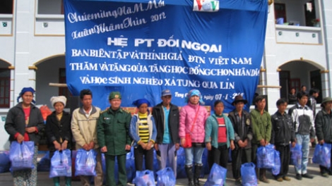 (VOV5) Với truyền thống “lá lành đùm lá rách”, “thương người như thể thương thân”, dịp cận tết Nhâm Thìn 2012, Đoàn cơ sở Hệ phát thanh đối ngoại, phối hợp với Đoàn thanh niên Ban thư ký biên tập và thính giả, Đài Tiếng nói Việt Nam tổ chức chuyến đi tặng quà cho các đồng bào nghèo, học sinh nghèo ở xã Tung Qua Lìn, huyện Phong Thổ, tỉnh Lai Châu. Nơi mấy năm về trước xảy ra vụ lở đất, 200 hộ dân ở khu vực có nguy cơ sụt lở cao được di dời, tái định cư lên địa điểm mới, cách nơi ở cũ hơn một cây số.