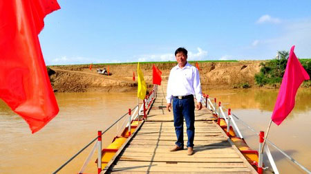 | Anh Nguyễn Tất Dũng đứng trên cây cầu phao của mình vừa khánh thành (Ảnh: Dân trí) |