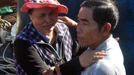 Đang ăn trưa, nghe chồng gọi điện báo: "Tàu chìm rồi", bà Lèo ngã xuống nền nhà ngất xỉu. May mắn, chồng bà và 6 ngư dân được các chiến sĩ ở đảo Song Tử Tây (Trường Sa) cứu và đưa vào bờ.