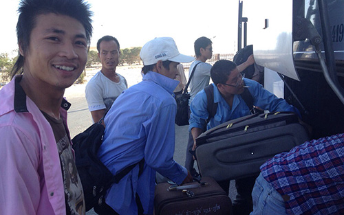 | Các công nhân vui mừng xếp hành lý lên xe chuẩn bị về Cairo |