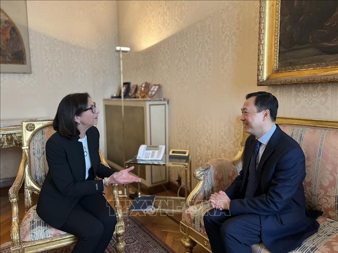 Đại sứ Việt Nam tại Italy Dương Hải Hưng gặp bà Cinzia Teresa Torraco, Thủ hiến Genova (Italy). Ảnh: Thanh Hải/PV TTXVN tại Italy |